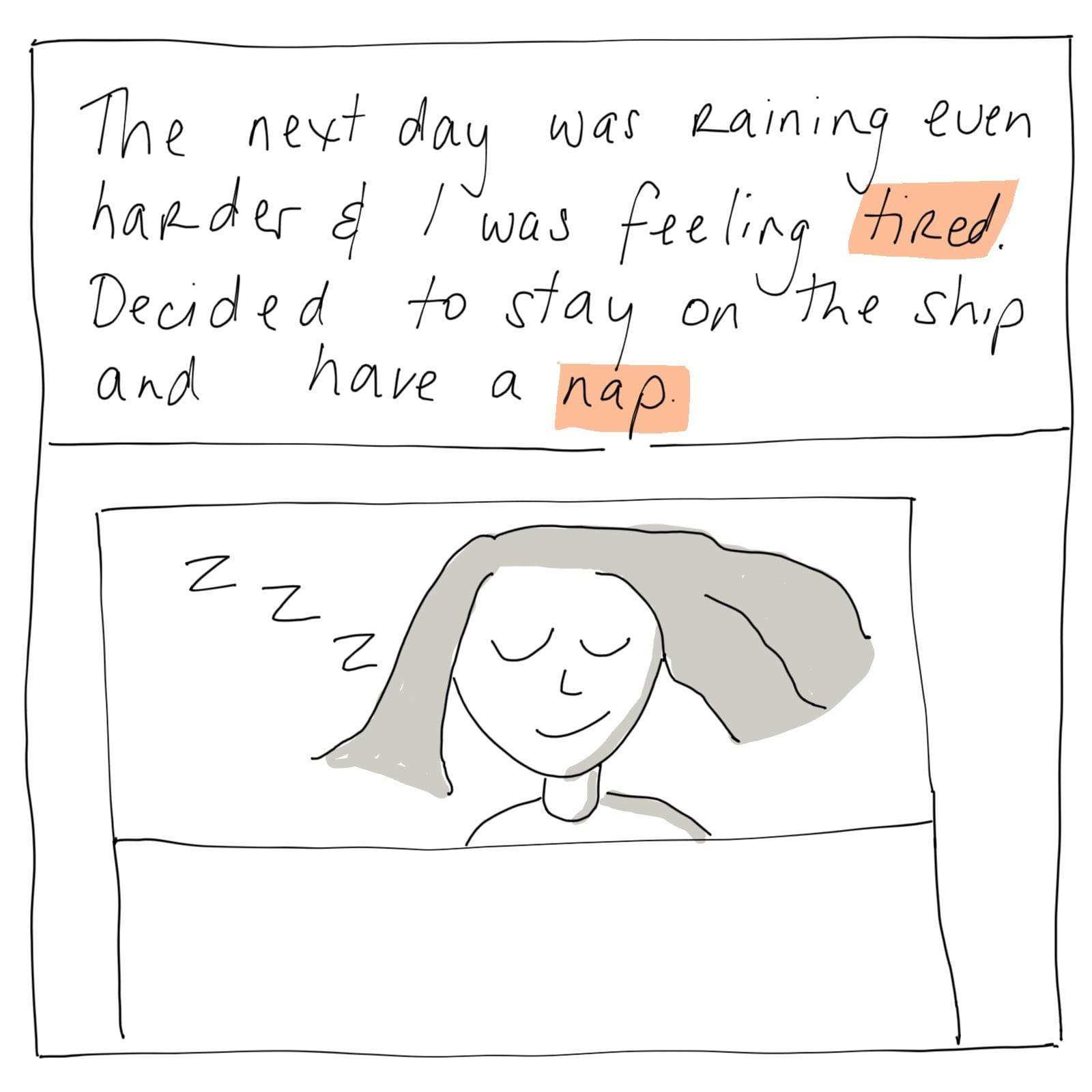 I'm feeling claustrophobic just looking at the tiny room. Your a trooper. I can't wait to find out what happens with the story. Anticipation build up. I also like the photos you took intertwined with the cartoon artwork. Very cool.